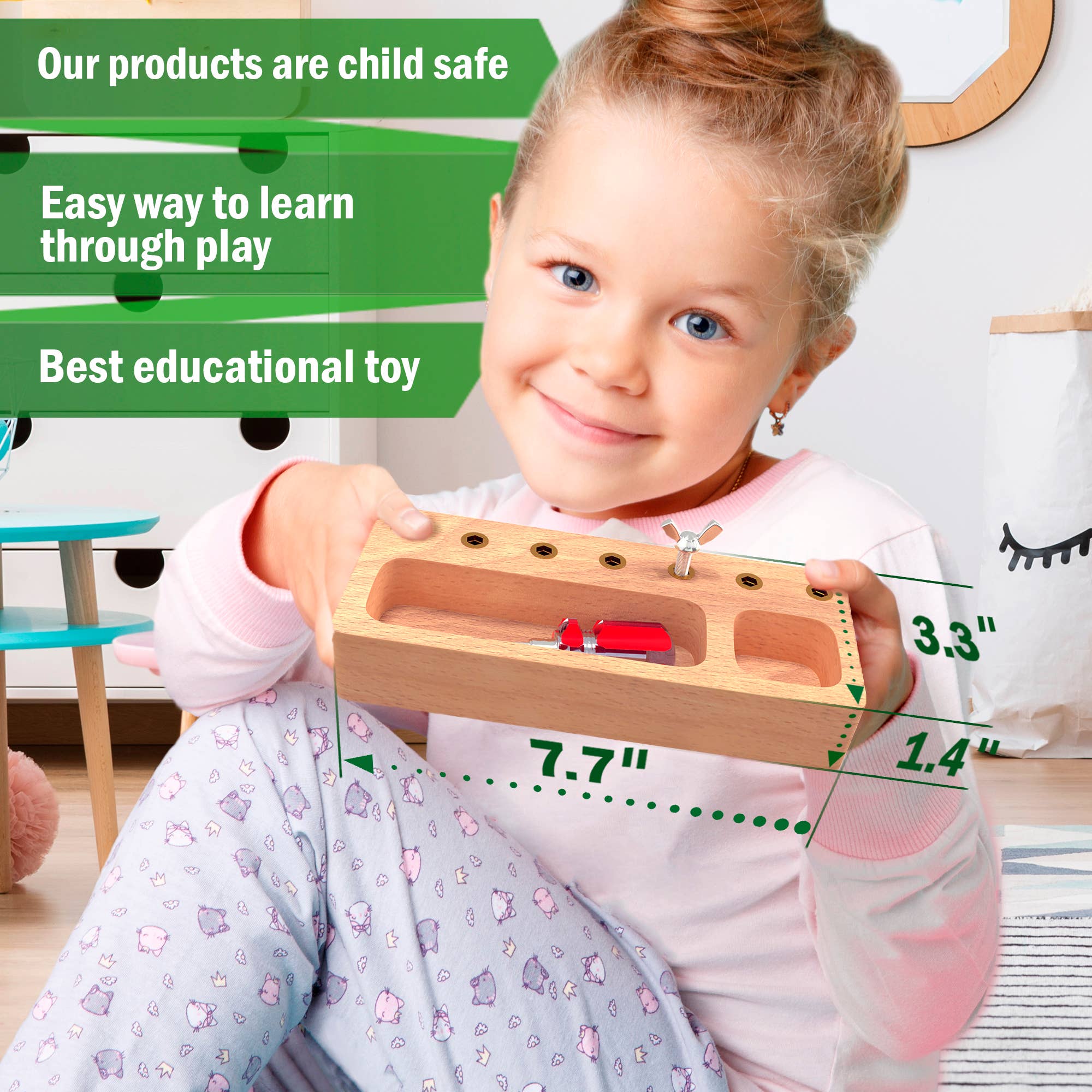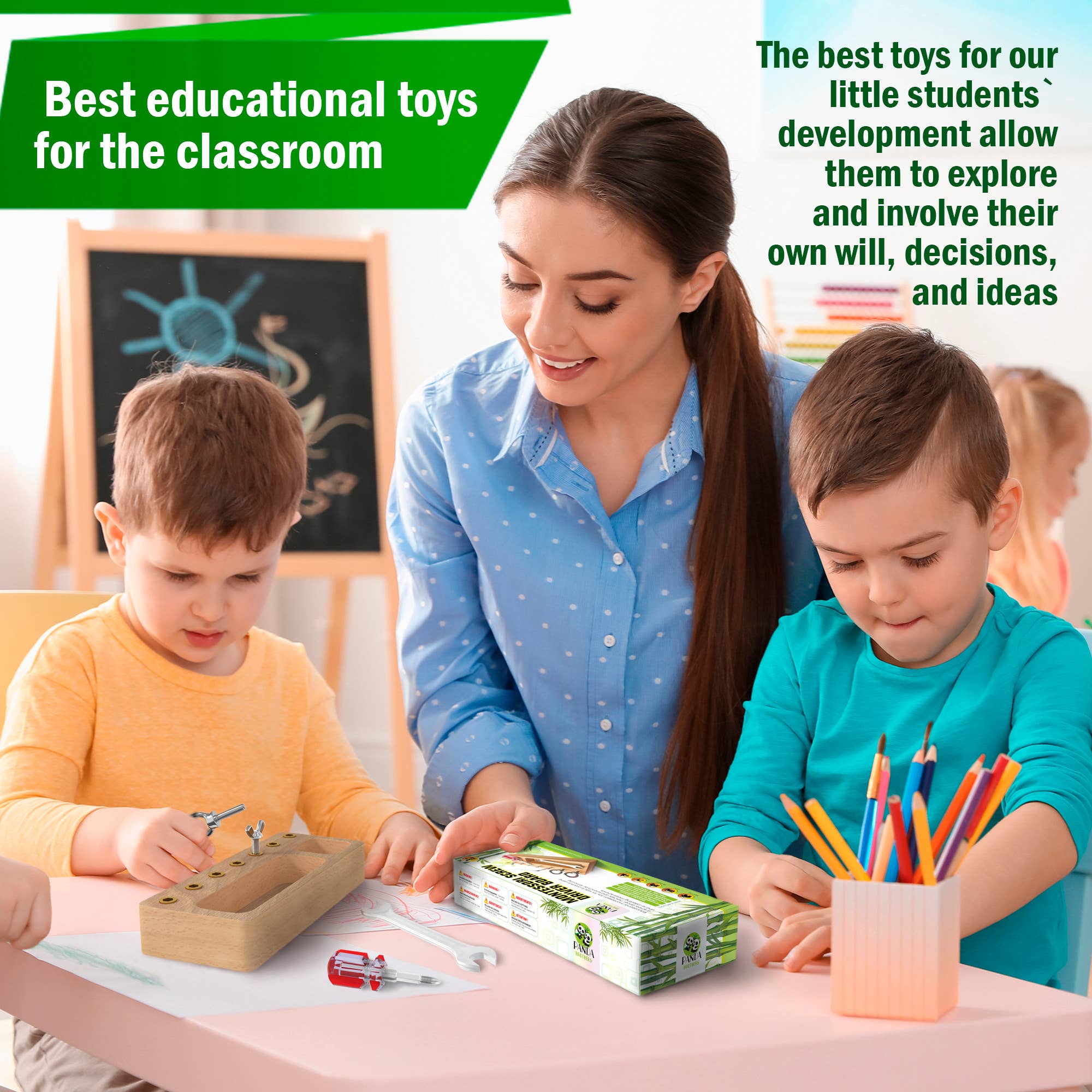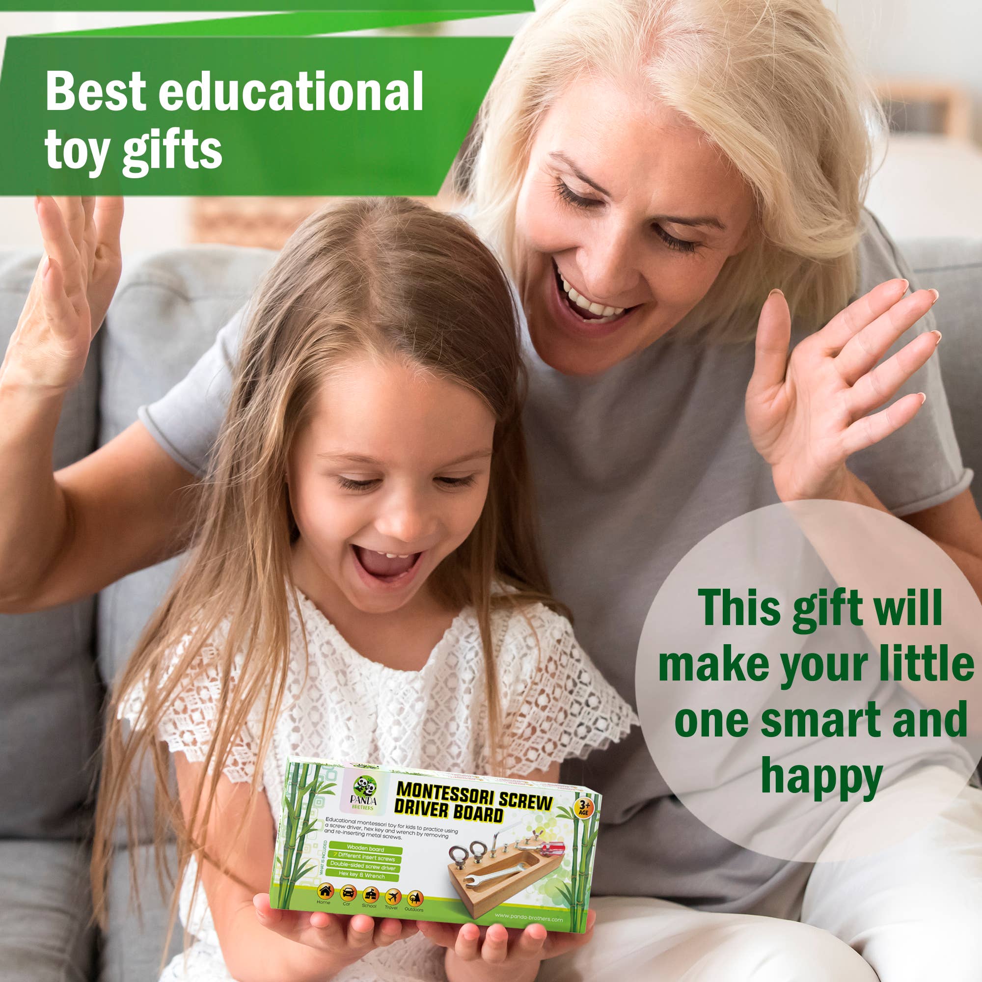 Wooden Busy Board - Panda Brothers Montessori Screwdriver Board - educational toy for kids to learn the tools. The Panda Brothers Montessori Screwdriver Board is a unique basic skill educational board that allows children to learn their way into the independent solving of real-world challenges. It helps children (up 3 years old) learn the practical life skill of using a screwdriver, working with various tools, and holding the keys correctly, while training hand-eye coordination and developing their fine motor skills.