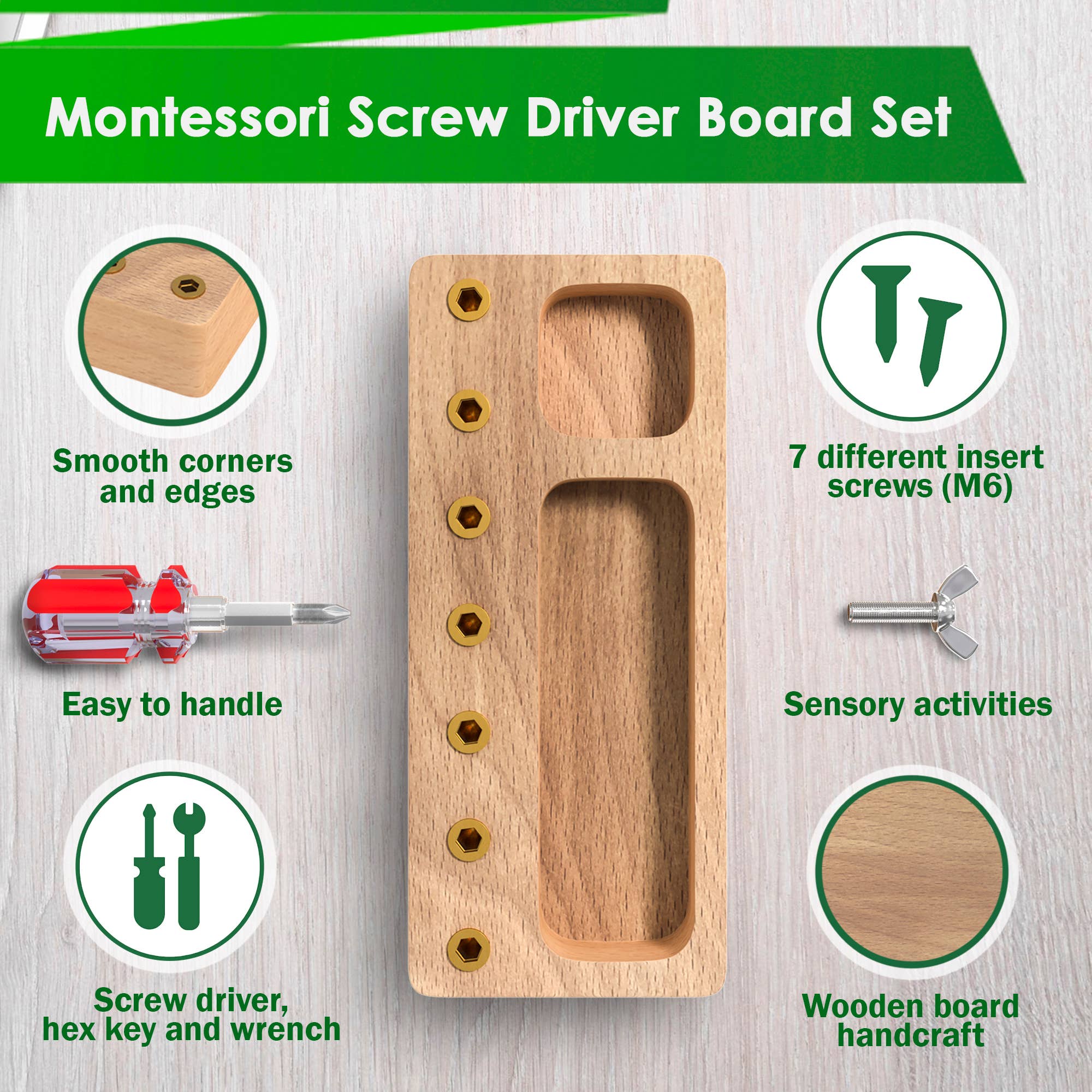 Multiple Activity Set. Your Child can safely practice the action of removing and re-inserting the 7 different insert screws while improving their recognition ability and sensory activity. The board also features two insets, one for holding the screwdriver, and another for holding the bolts once they've been removed. Product Details: Dimensions: 8 x 3.7 x 1.7 inches Item Weight: 1.4 pounds Set includes: Screwdriver, Hex key, Wrench and 7 different insert bolts
